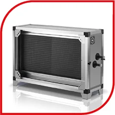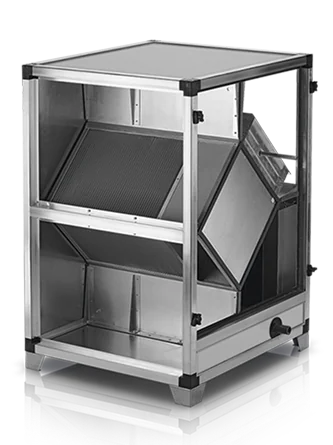 Пластинчатый перекрестноточный рекуператор отечественного производства. Рекуператор комплектуется клапаном байпаса на все сечение, что позволяет снизить время разморозки, перекрывая доступ приточного воздуха в рекуператор. На вытяжном канале установлены каплеуловитель и поддон. Возможно применение рекуператора с эпоксидным покрытием для работы в агрессивных средах.