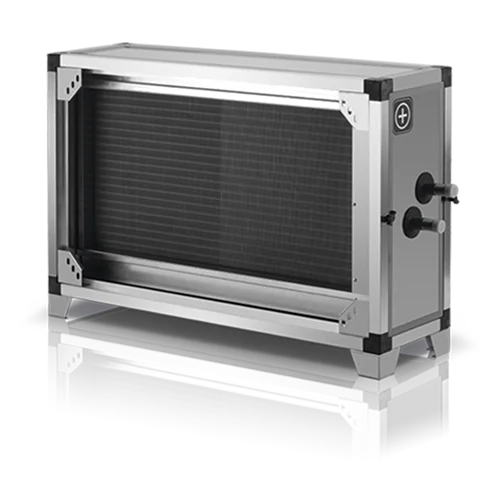 Применяются Cu-Al теплообменники отечественного производства. Высокая эффективность достигается за счет оптимизированного шага оребрения и уменьшенного аэродинамического сопротивления. Калачи с увеличенной толщиной стенки 0,35 мм позволяют снизить риск разрыва при разморозке теплообменников. Каплеуловители специальной формы позволяют использовать их при высоких скоростях без потери по эффективности. Максимальная температура теплоносителя 130°С, давление 1,6 МПа, возможность работы с этилен/пропилен гликолевыми смесями. Возможность применения хладагентов R407C, R410A, R314a.