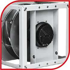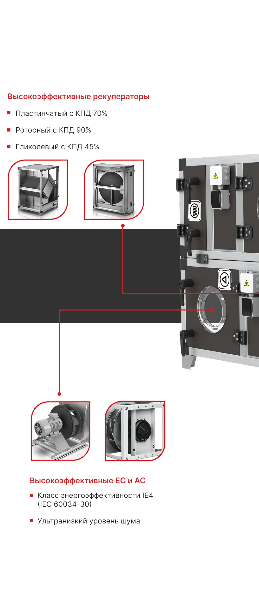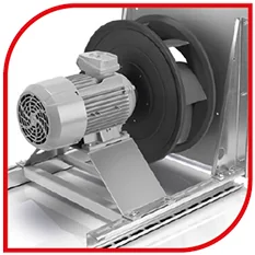 Применяются рабочие колеса ведущих производителей. Возможность гибкой конфигурации системы обеспечивается за счет применения АС электродвигателей с классом эффективности EI2 и ЕС двигателей с наивысшим классом эффективности EI4 или применение альтернативных двигателей АИР. Для снижения вибраций и увеличения срока службы осуществляется балансировка каждой пары «колесо-двигатель». Для исключения передачи вибраций на корпус установки рама вентилятора устанавливается на виброизоляторы.