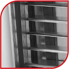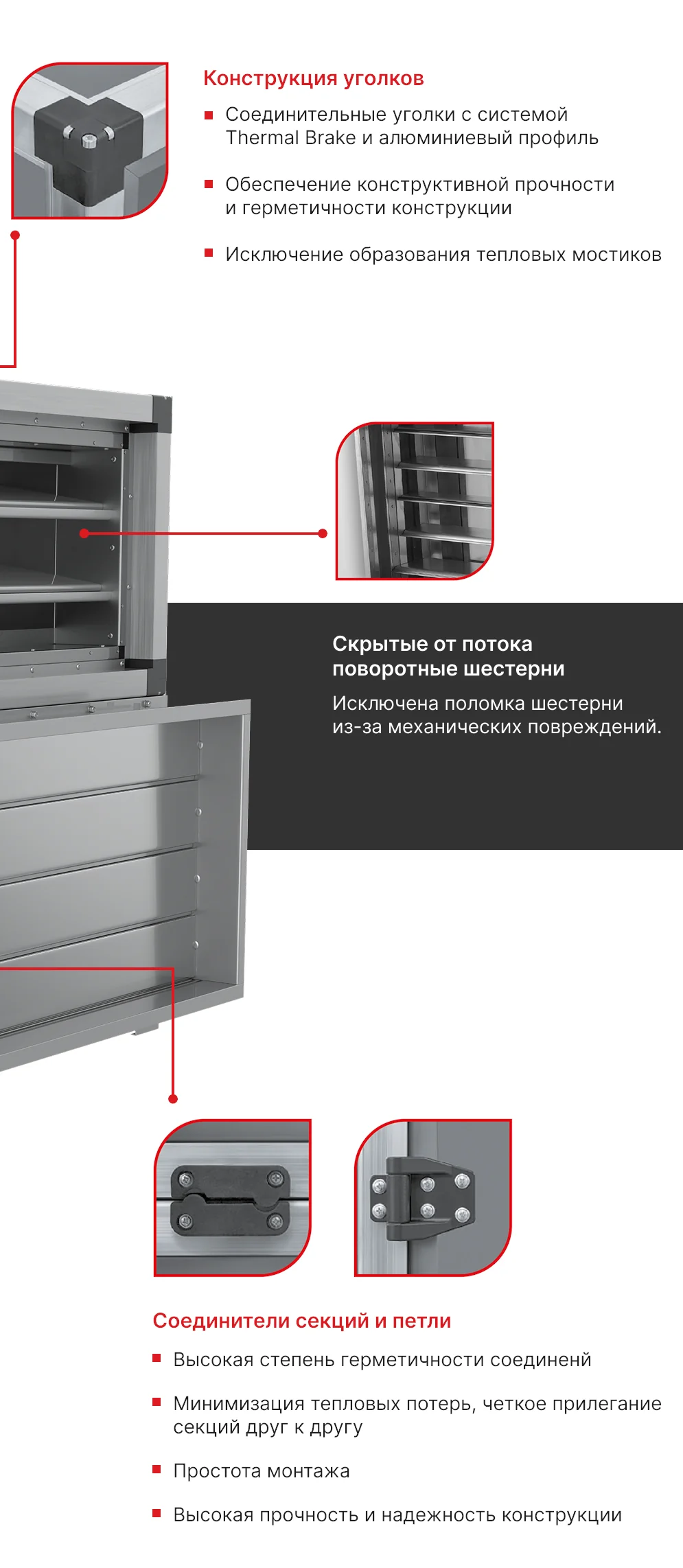Применяются скрытые от потока поворотные шестерни, что увеличивает ресурс воздушного клапана и устраняет возможность поломки шестерни при попадании инородных предметов в клапан. Для северных регионов клапаны опционально снабжаются периметральным электрическим подогревом, что позволяет эксплуатировать установки до -40°С.